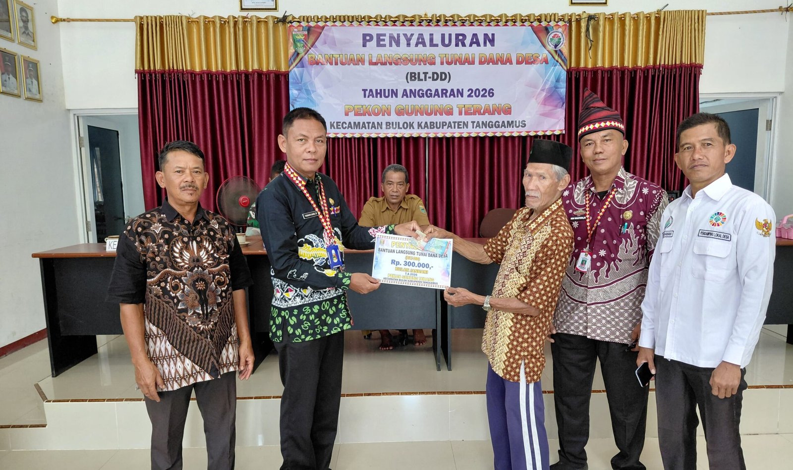 TANGGAMUS – Pemerintah Pekon Gunung Terang, Kecamatan Bulok, Kabupaten Tanggamus, merealisasikan penyaluran Bantuan Langsung Tunai Dana Desa (BLT-DD) Tahun Anggaran 2026. Penyaluran bantuan periode bulan Januari, Februari, dan Maret ini dipusatkan di balai pekon setempat dengan menyasar 10 Keluarga Penerima Manfaat (KPM), Rabu (22/04/2026).